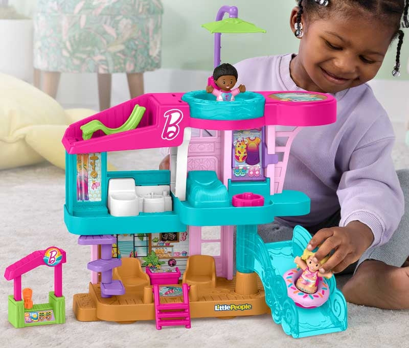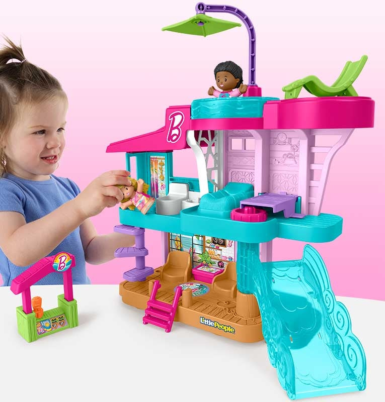 Toddlers can head to the beach for endless pretend play with this Little People Barbie Beach House playset from Fisher-Price. This Barbie-themed set features 3 floors of play for kids to explore, including a stylish living area, bedroom with fold-down wall bed, bathroom, movable “wave” slide, and a relaxing roof-top deck with a hot tub, umbrella and lounge chair. Featuring 2 figures, 3 play pieces, and lots of hands-on activities, kids will love imagining epic beach days with their Barbie friends. Colors and decorations may vary.