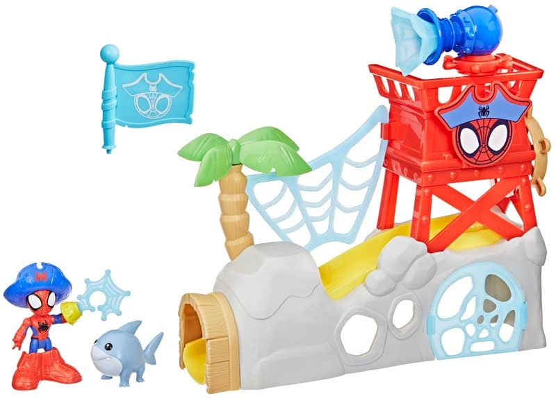 Kids can imagine swashbuckling action and adventure with the Marvel Spidey and his Amazing Friends Water-Webs Spidey Island, from Hasbro! Playset comes with a poseable 3-inch (7.6 cm) Spidey toy, as well as Jeff the Landshark slug figure, and features a trap door with slide, cave capture, and more. Transform Spidey into Pirate Spidey with detachable pirate hat, boots, and hook accessories. Also comes with removable palm tree, flag, and web cannon that the Spider-Man figure can hold with his c-grip hand! Encourage imaginative pirate play for boys and girls ages 3 and up, with more Marvel Spidey and his Amazing Friends toys, including figures, toy vehicles, and playsets! Cool Marvel toys make great gifts for kids, on birthdays, holidays & other special occasions!